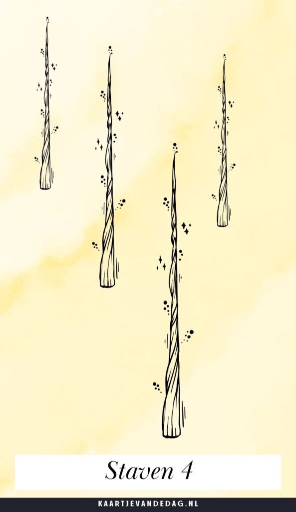 - Relatie: Staven 4 is een kaart van commitment en stabiliteit. Dit kan wijzen op een verloving, huwelijk of een andere belangrijke stap binnen je relatie. Het benadrukt de waarde van samenzijn en gedeelde groei.